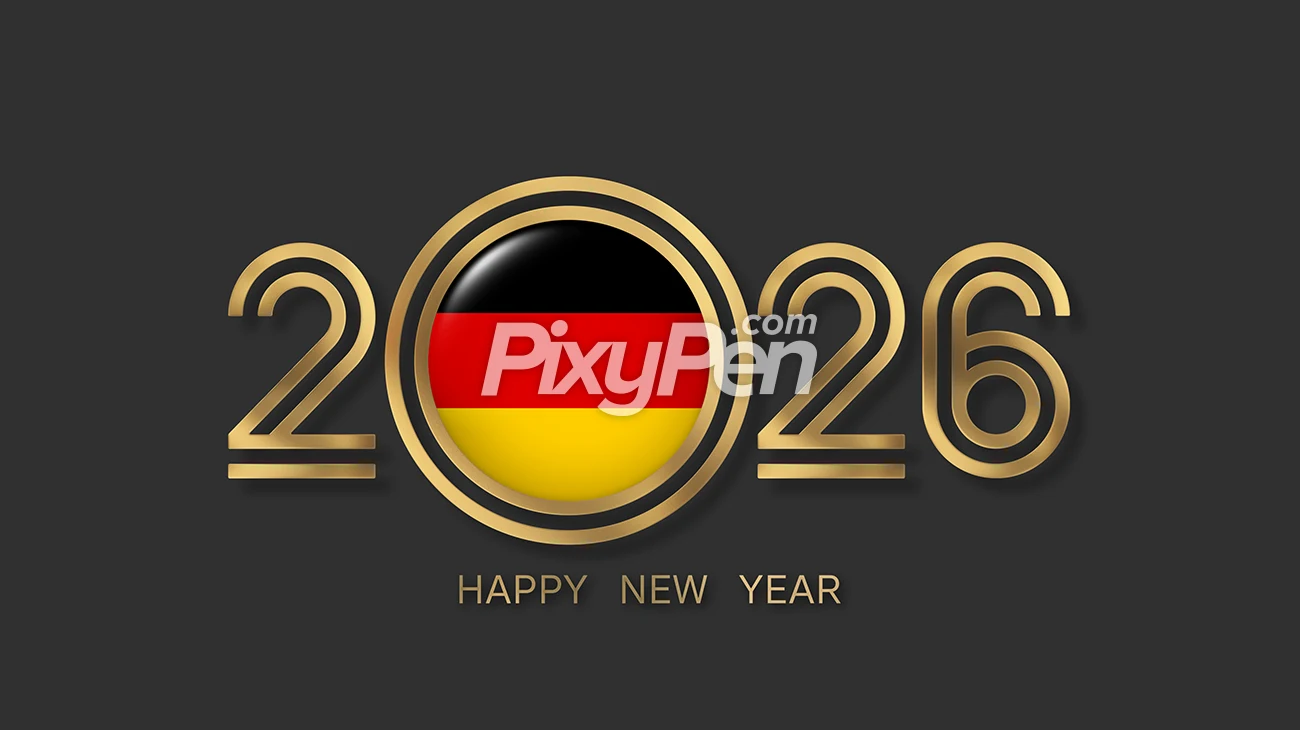 A high-quality image of happy new year 2026 Germany with the German flag. The flag of Germany is placed inside the zero of 2026 and the whole number has a gold material effect. Low-price Customization is available as low as $7, including background color changes and adding custom messages! A 4K transparent background PNG, High-resolution 4K (3840 x 2160), Full HD (1920 x 1080), HD (1280 x 720), and a small preview (800 x 450) JPEG included.