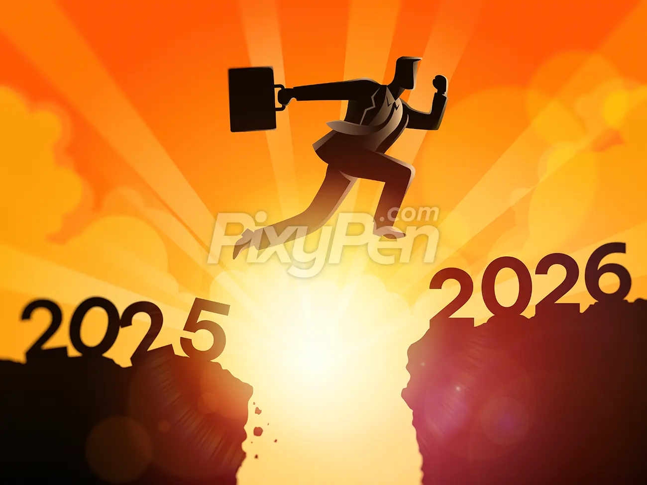 Silhouette of a young man is jumping between 2025 and 2026 over the gap of a hill in a beautiful sunrise or sunset. It’s time to say goodbye to 2025, hello 2026, and say happy new year 2026. The image has the concept of home, determination, and success. It can be used for any purpose for New Year greetings and also New Year’s resolution background and wallpaper.