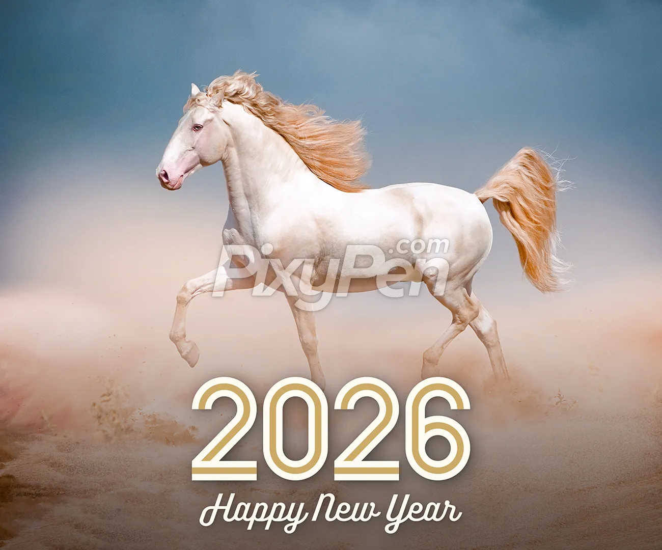 Happy New Year 2026 card, wallpaper, and banner design with a strong and beautiful horse (Akhal-Teke) image in the background. Akhal-Teke is the most famous horse breed in Iran and Turkmenistan countries. Low-price Customization is available as low as $5 (adding personal messages, wishes, or any text)! High-resolution (3860 x 3220) JPG and small preview (800 x 666) JPG are included.